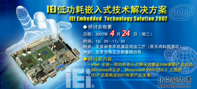 威強與北京經(jīng)銷商北京威達通于2007年4月24日首度共同舉辦“IEI Embedded Technology 2007之IEI嵌入式技術(shù)解決方案研討會”。