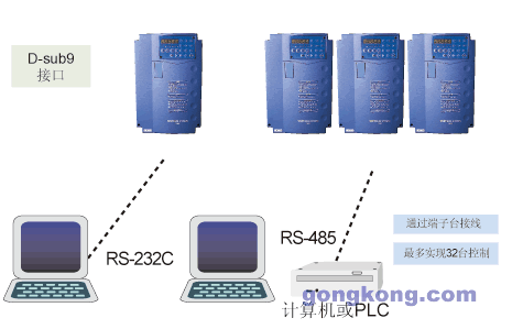 內(nèi)置標(biāo)準(zhǔn)D-sub9 RS232接口,可實現(xiàn)計算機(jī)與變頻器一對一的控制。
