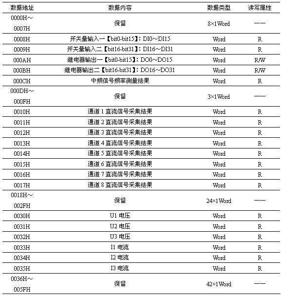  直流信號采集結果(數(shù)據(jù)地址0010H~0017H)。該寄存器數(shù)據(jù)位十六位有符號整型,待測信號的電流值分辨率為0.01mA,即如讀出值為3E8H(十進制1000),則實際電流值為10.00mA。數(shù)值為負時,表示實際信號接線與產品表示相反。