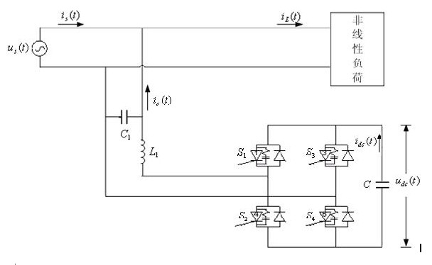 電壓型單相并聯有源濾波器結構原理圖 根據現場實際情況,在配電柜出線旁安裝一臺補償容量為30kVA的電力有源濾波器(APF)。