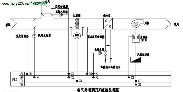 如空氣處理機(jī)PLC控制原理簡(jiǎn)圖所示: