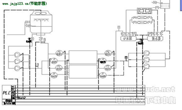 現(xiàn)介紹如下:我們本次的設(shè)計(jì)中有兩套中央空調(diào)系統(tǒng),由三臺(tái)冷卻水泵、三臺(tái)冷凍水泵、一臺(tái)冷卻塔風(fēng)機(jī)、兩臺(tái)冷水機(jī)組等主要設(shè)備組成兩套制冷系統(tǒng)(因系統(tǒng)小,冷卻塔功率大,實(shí)驗(yàn)室要求等,本系統(tǒng)較一般兩套制冷系統(tǒng)不同的是兩臺(tái)冷水機(jī)組卻只選擇一個(gè)冷卻塔,經(jīng)計(jì)算核定,這并不影響其效果)其中冷水機(jī)組是由設(shè)備生產(chǎn)廠成套供應(yīng)的。根據(jù)本次設(shè)計(jì)的實(shí)驗(yàn)室要求,我們選擇了2*5匹全封閉式壓縮機(jī)冷水機(jī)組。它一般是根據(jù)空氣調(diào)節(jié)原理及規(guī)律等由微處理器自動(dòng)控制。冷水機(jī)組由壓縮機(jī)、冷凝器與蒸發(fā)器組成。壓縮機(jī)把制冷劑壓縮,壓縮后的制冷機(jī)進(jìn)入冷凝器,被冷卻水冷卻后,變成液體,析出的熱量由冷卻水帶走,并在冷卻塔里排入大氣。液體制冷劑由冷凝器進(jìn)入蒸發(fā)器蒸發(fā)吸收熱量,使冷凍水降溫,然后冷凍水進(jìn)入冷風(fēng)機(jī)盤(pán)管吸收空氣中的熱量。 如此循環(huán)不已,把室內(nèi)的熱量帶出,達(dá)到降低環(huán)境溫度的目的。因此,中央空調(diào)冷凍系統(tǒng)的工藝控制要求為: