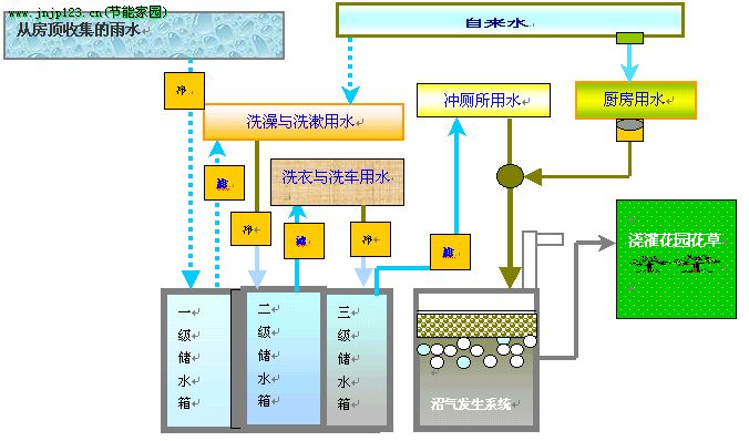 經(jīng)過特殊設(shè)計的飲用水凈化、活化裝置處理后的自來水,主要作為廚房的生活飲用水,(廚房刷洗用后的廢水,直接進入沼氣發(fā)生系統(tǒng))在降水不足季節(jié)的洗浴用水則取自于自來水,在夏、秋、冬季節(jié),洗浴用水則取自于經(jīng)過凈化、活化、磁化、PH值中和處理后的一級儲水箱收集存儲的雨水(預(yù)計在雨水相對充沛的地區(qū),全年約有9個月的時間能夠利用收集到的雨水洗。,洗澡和洗漱用后的水,通過管道進入二級儲水箱(在嚴重缺水的地區(qū),洗浴用水也可通過特殊的處理系統(tǒng)處理后再循環(huán)使用,繼續(xù)作為洗浴用水,從而進一步節(jié)約用水),再經(jīng)過濾及殺菌、活化、磁化處理后,用于洗衣和刷洗車輛,洗衣和刷洗車輛后的水及從院子地面上收集的雨水收集存儲在三級儲水箱中,從三級儲水箱提出的水經(jīng)簡單的過濾凈化處理后,用于沖廁所和澆灌花草樹木。由廁所排出的流體物質(zhì)進入四季型沼氣發(fā)生系統(tǒng)(沼氣系統(tǒng)的沼氣菌種為借助生物工程轉(zhuǎn)基因技術(shù)培育的新菌種,對有機物的分解率和產(chǎn)氣率都將大幅度提高),經(jīng)發(fā)酵處理后產(chǎn)生沼氣,其沼氣液經(jīng)臭氧發(fā)生處理器除臭后,用于澆灌住宅周圍的花草(在干旱少雨地區(qū),澆灌用沼氣液的不足部分可從三級儲水箱中取水補充),從而使得花木枝繁葉茂,不僅使周圍的綠化質(zhì)量大幅度提高,改善居住空間的周邊生態(tài)環(huán)境和空氣狀況,而且能夠得到充足的產(chǎn)生沼氣用原料,形成一個以家庭為單元的獨特的良性生態(tài)循環(huán)體系。