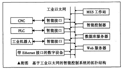 基于工業(yè)以太網(wǎng)的智能控制系統(tǒng)的拓?fù)浣Y(jié)構(gòu)如附圖所示,系統(tǒng)中各主要部分的功能如下。