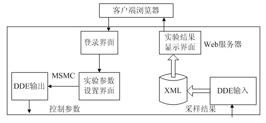 登錄界面,實驗參數設置界面和實驗結果顯示界面都是用ASP.NET建立的動態(tài)網頁Socket客戶端程序和Socket服務器程序是用VB.NET編寫,在Web服務器中同時設置Socket的服務器程序和客戶端程序是為了將修改后的實驗參數及時的送給工控機,實現在線實時調節(jié)參數的功能。同時工控機送回的采樣值被寫入XML文件,實驗參數從參數設置界面?zhèn)鹘oSocket客戶端程序,它們之間采用微軟消息隊列進行通信,是并發(fā)執(zhí)行的。Socket服務器程序將工控機送回的采樣值寫入XML文件,實驗結果顯示界面同時讀這個文件,并將其中的數據轉換成圖形的形式展現給用戶。