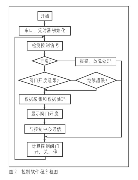 控制軟件采用C語言,為提高程序的可靠性和可理解性,將程序設計成相對獨立的子程序,有利于程序的移植和修改?刂栖浖饕δ苁墙邮諄碜钥刂浦行牡闹噶罨蚩刂破魃祥_、關鍵指令;接受閥門開度反饋信號,計算后輸出控制信號;向控制中心反饋信息;實時顯示閥門開度;故障報警、故障處理,其程序主框圖如圖2。