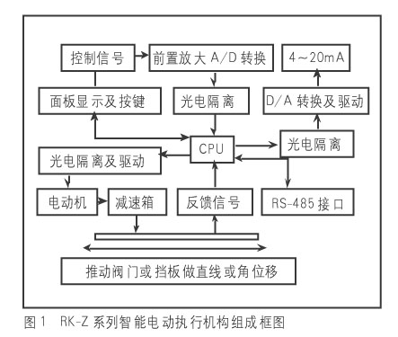 針對上述問題,上海銳凱儀表有限公司花大力氣開發(fā)了新一代RK-Z系列智能電動執(zhí)行機構,較好解決了這些缺陷和不足。RK-Z系列智能電動執(zhí)行機構系統(tǒng)構成見圖1所示。它采用全封閉、一體化結構,配以單相永磁式交流同步電動機,體積小、重量輕、結構簡單、傳動慣量小、轉(zhuǎn)矩大等特點。限位和剎車采用逐步逼近電子技術,實現(xiàn)了閥門“柔性全開”和“柔性全關”,取消了限位開關和剎車片,解決了長期以來困擾的限位開關易失靈、剎車片易“抱死”以及剎車時易產(chǎn)生大沖擊電流燒壞電動機等老大難問題。為提高整機可靠性,采用了可靠性設計、可靠性試驗、失效分析和嚴格的篩選、老化等工藝措施,并最大限度地減少了可動部件,使整機MTBF值達到40000萬小時以上。