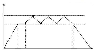 其中槽輥運轉(zhuǎn)控制要用到擺頻功能,雖然丹佛斯VLT2800已經(jīng)具有帶擺頻功能的機型,但考慮到成本,決定還是用PLC模擬,擺頻模式按圖2所示。