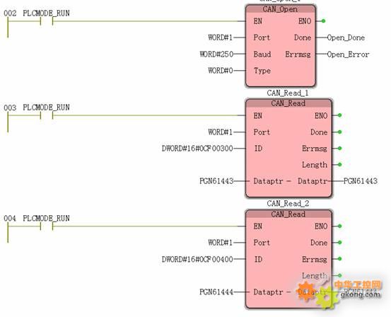 以標(biāo)準(zhǔn)的J1930協(xié)議250KB速率打開CAN通迅口,新建兩個CAN_READ功能塊分別讀取PGN61443與PGN61444。