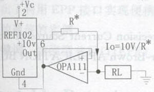 REF102是10V精密電壓參考源,精度為±0.0025V,溫漂為2.5ppm/℃max,可滿足本系統(tǒng)電阻測(cè)量的要求。OPA111精密運(yùn)算放大器作為電壓跟隨器,使得REF102的GND端和放大器的同相端相等,即R*為高精度、低溫漂的精密電阻,則流過(guò)RL的電流為精密恒定電流。整個(gè)電路等效為恒流源電路。