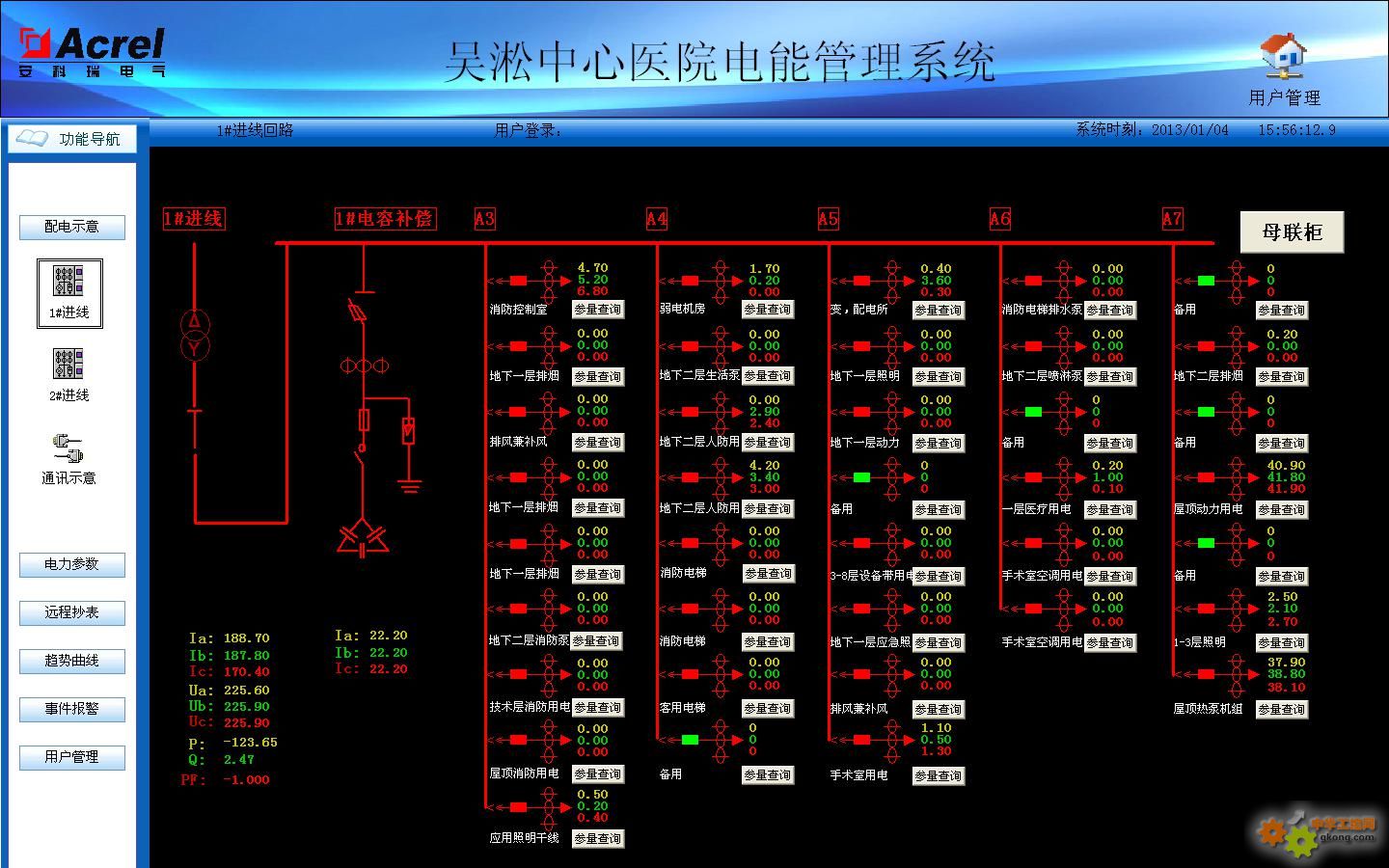 隨著社會的發(fā)展及電力的廣泛應用,智能電能管理系統(tǒng)已成為大型公共建造的必然選擇,本文介紹的電力儀表及Acrel-3000電能管理系統(tǒng)在吳淞中心醫(yī)院項目的應用,可以實現(xiàn)遠程遙測、遙信功能,實時顯示了現(xiàn)場電參量,方便值班人員查看;給高級用戶設置定值修改功能同樣人性化地提高了值班人員操作的安全系數(shù);同時系統(tǒng)實現(xiàn)對采集數(shù)據(jù)的分析、處理,并生成各種電能報表、分析曲線、棒圖等,便于電能的遠程抄表以及分析、研究;報警窗口的彈出有助于提醒值班人員及時檢查現(xiàn)場設備的運行狀況。