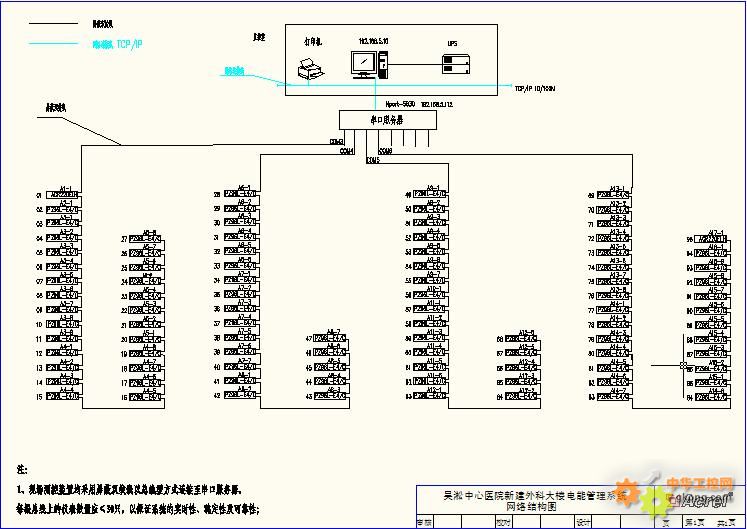 整套電能管理系統(tǒng)站控管理部分包括監(jiān)控管理主機、打印機、UPS電源等;網(wǎng)絡通訊層部分包括一個16口的串口服務器;現(xiàn)場智能儀表監(jiān)控設備層由ACR220ELH和PZ96L-E4組成。該配電系統(tǒng)分布在一個變電所內(nèi),2臺變壓器的所有電力儀表通過RS485總線連接至串口服務器,并經(jīng)過超五類網(wǎng)線上傳至監(jiān)控后臺。