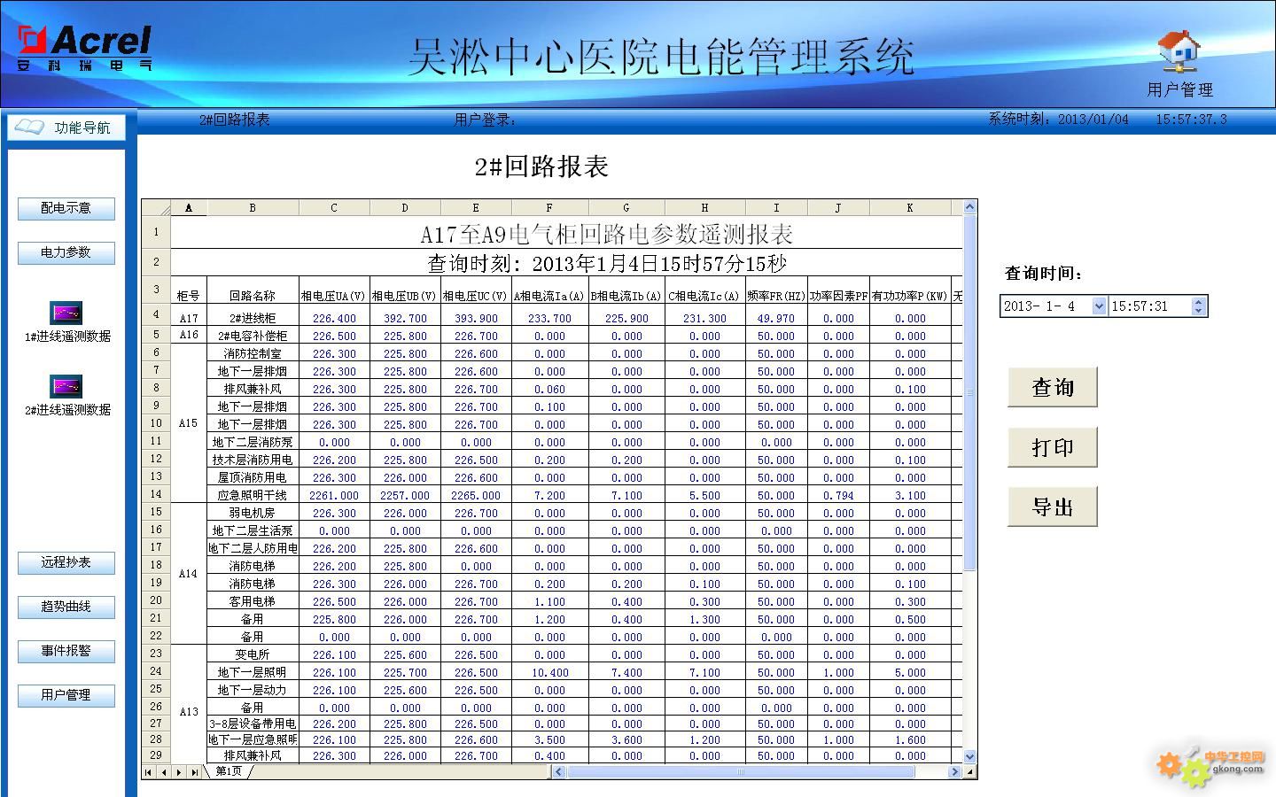 登錄普通權限用戶,通過主界面的操作,可以查看各回路運行的電參量(電流、電壓、有功、無功、功率因數(shù)、電度);登錄最高權限用戶,可以實現(xiàn)系統(tǒng)內(nèi)部電度報表、電流曲線、報警信息的打印及導出功能。